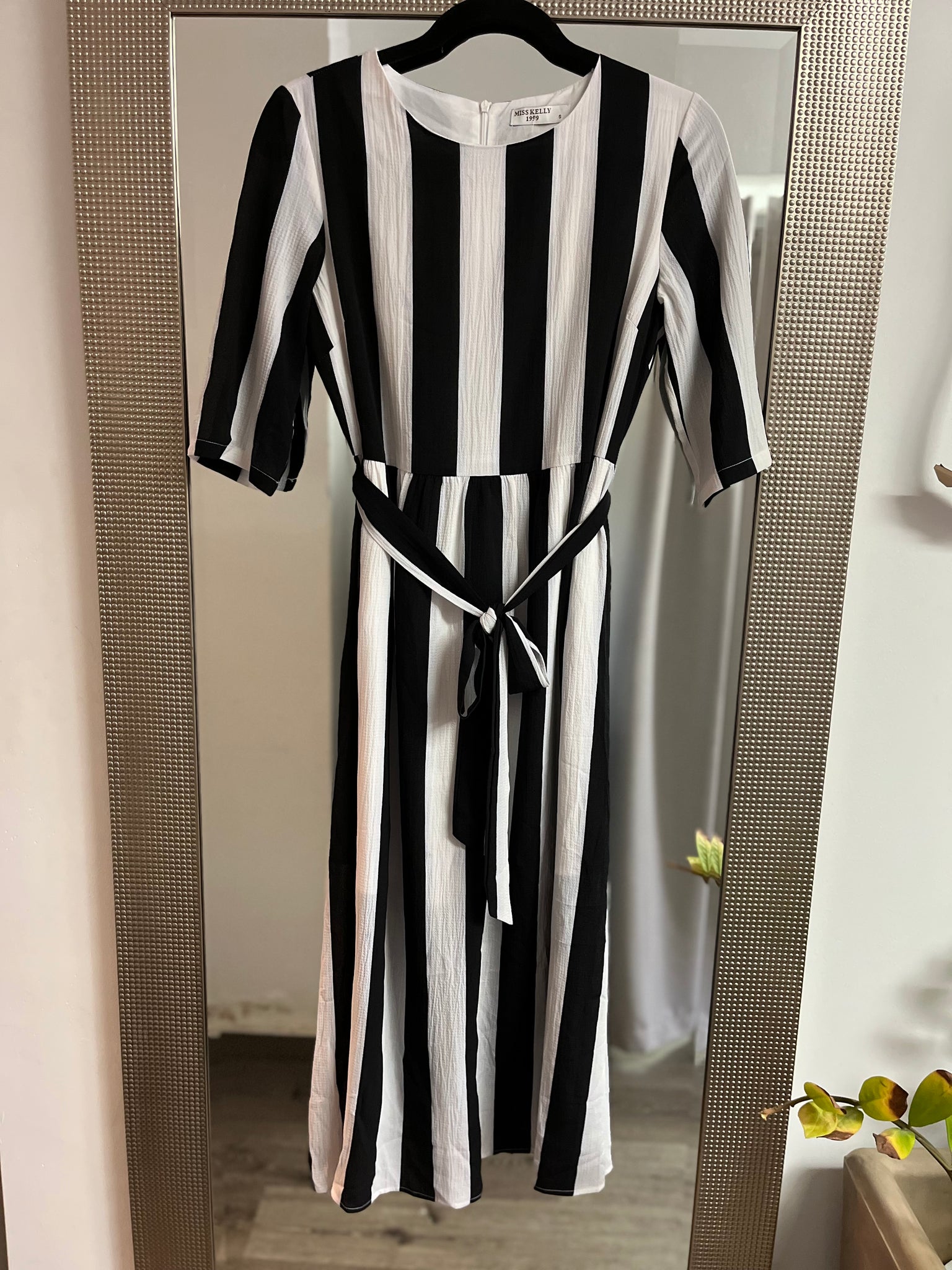 Manga 3/4. Zipper trasero. Incluye cinturón de tela. La tela no estira y no tiene bolsillos. Largo midi.