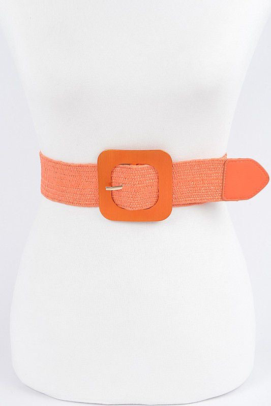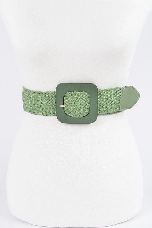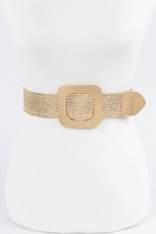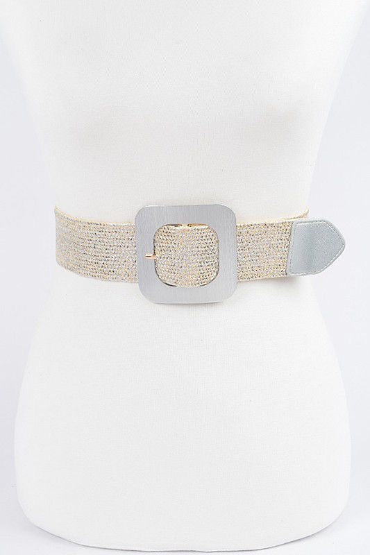 Square metal buckle. Elastic. Regular size. Extends from small to XL.