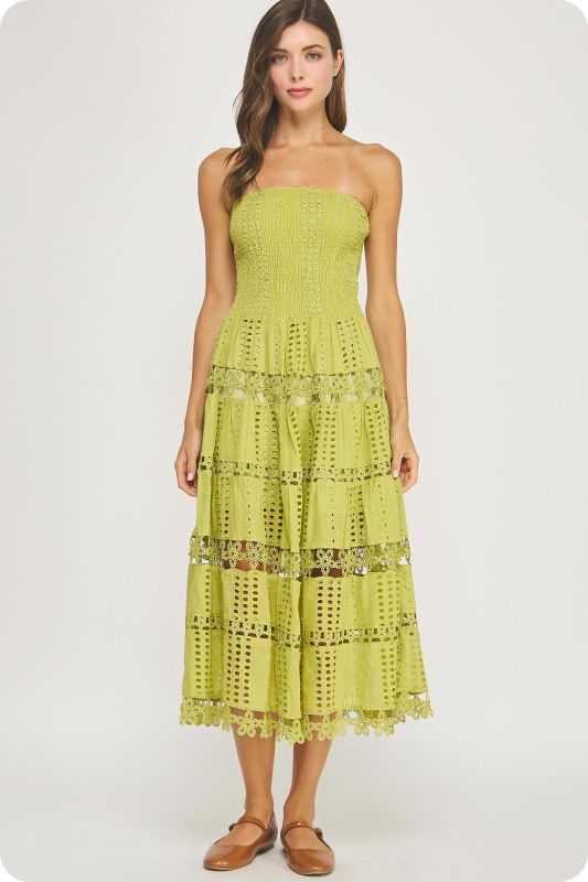 Vestido strapless con elástico en la parte superior. Tiene forro en la falda y detalles de eyelet con croché a la vuelta redonda. Corre según su talla.