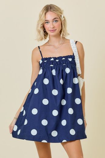 Slip on navy blue polka dot mini dress. Adjustable spaghetti straps with elastic in the top.