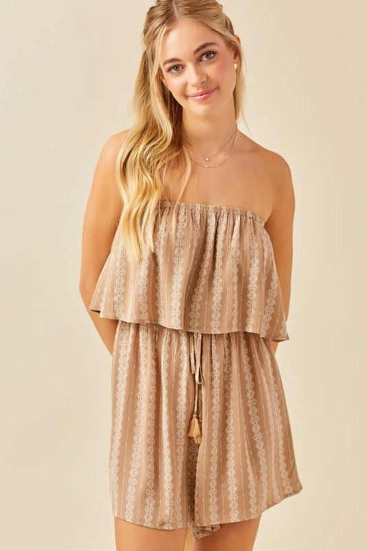 Slip on strapless romper with elastic waistband. No pockets. Wrap bow detail in the front. Fully lined. Nude color with ivory print.