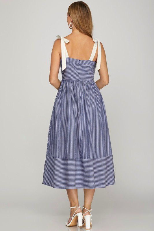 Beautiful midi length dress. Adjustable bow straps. Zips up at the back with secure clip. Has side pockets. Woven Non stretch fabric.