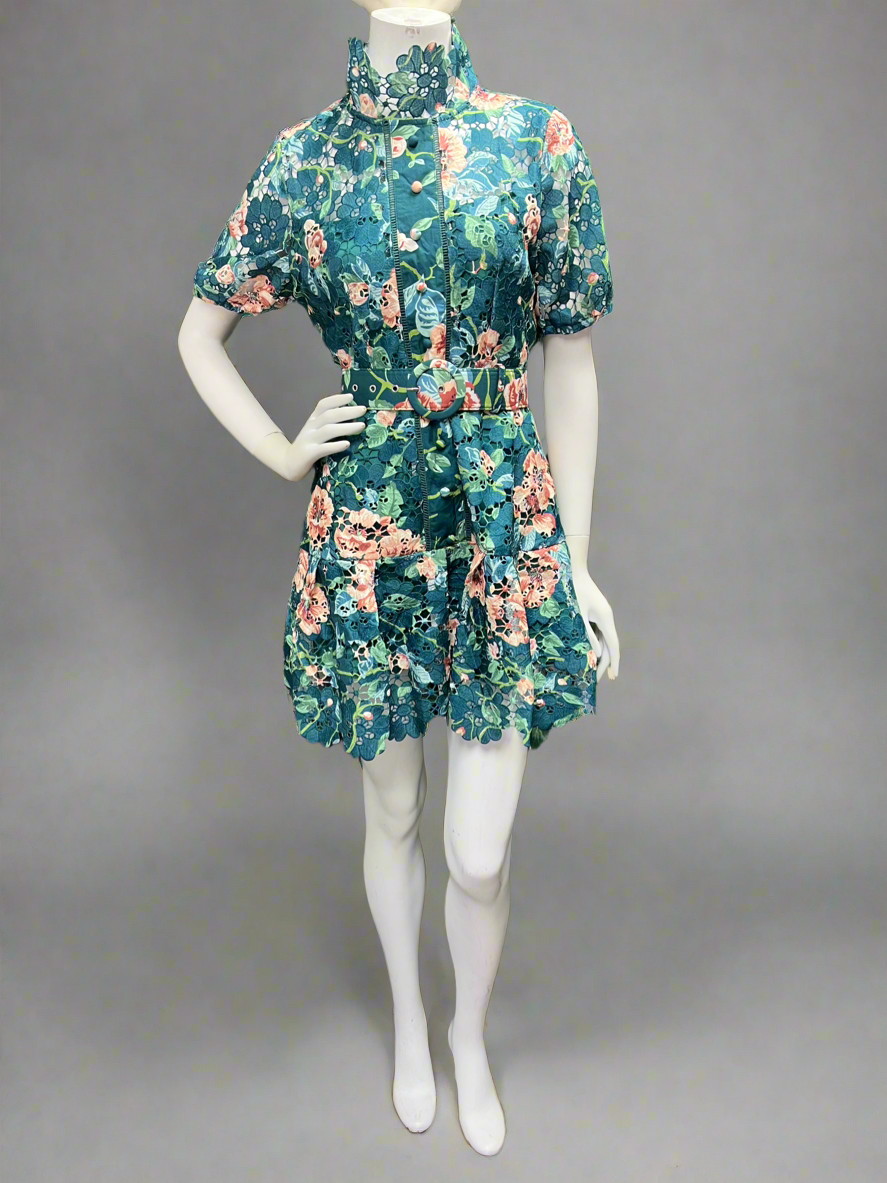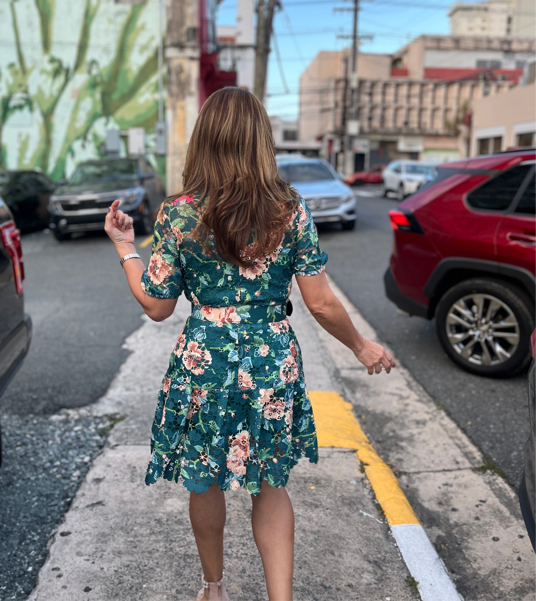 Lace mini dress. Fully lined. Matching belt included. Runs true to size. Model is wearing size small.