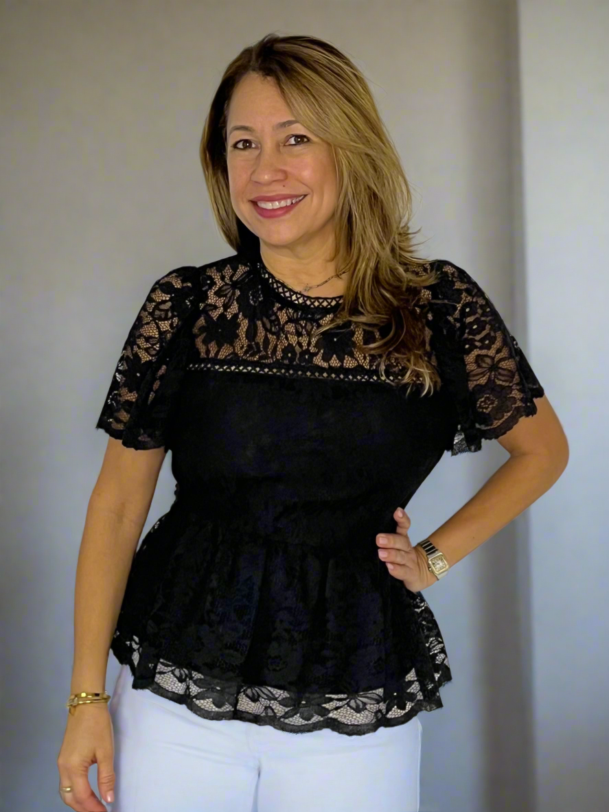 Estilo peplum. Cierre de botón y zipper en la parte posterior. Hombro transparente. Forrado. Corre según la talla. 3% spandex.