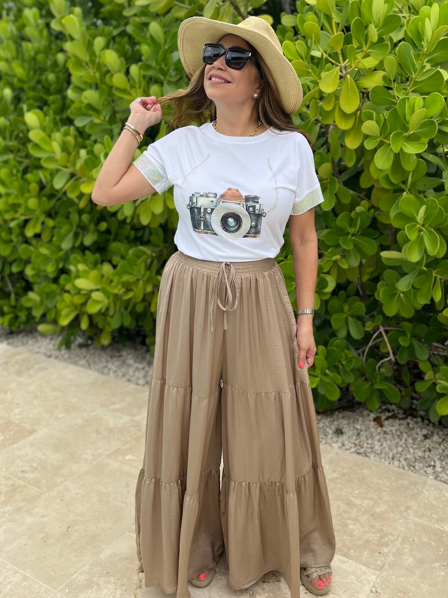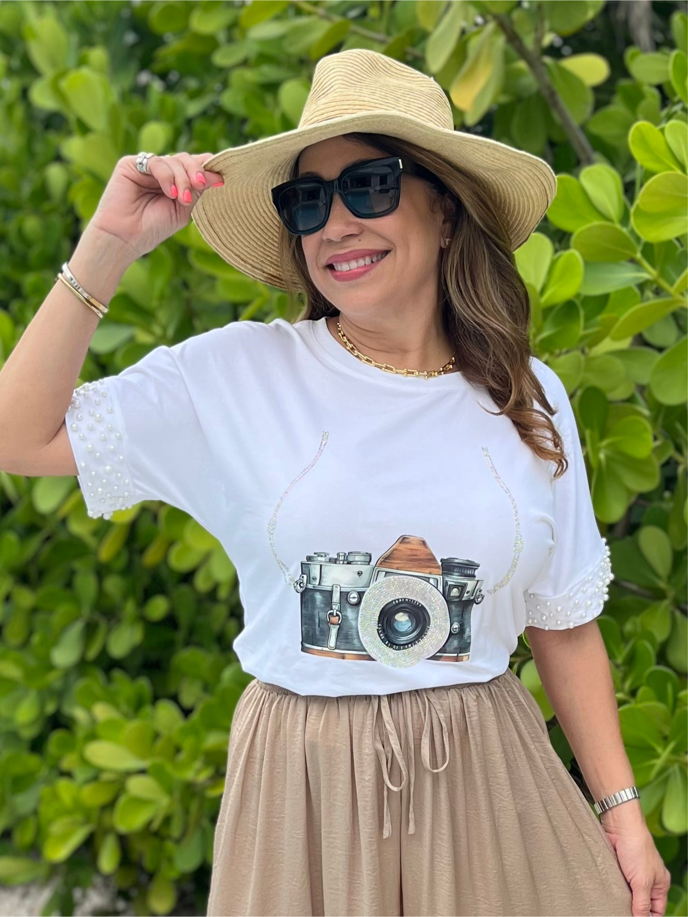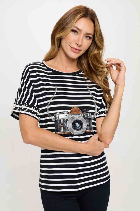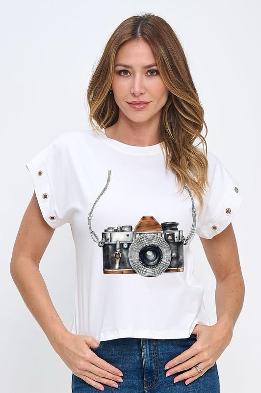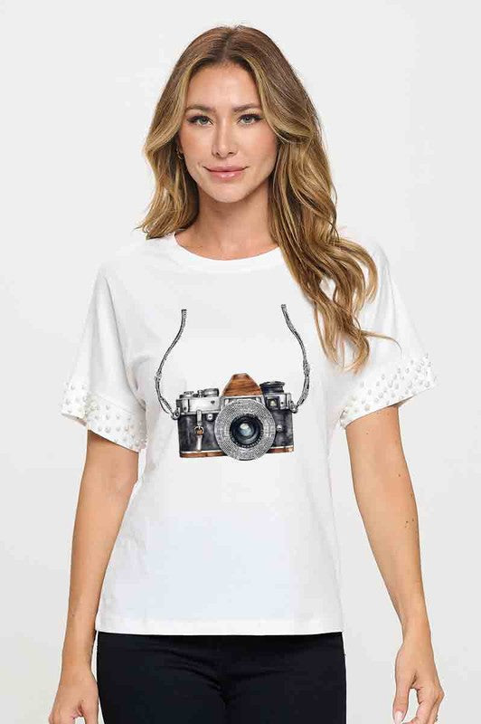 Stand out with this stylish white t-shirt featuring glittery sparkle sleeves or pearls and a bold camera graphic on the front. Crafted from soft, breathable cotton blend fabric, it combines comfort with statement-making style. The shimmering sleeves add a fun, fashionable touch, perfect for casual outings, photoshoots, or everyday wear.