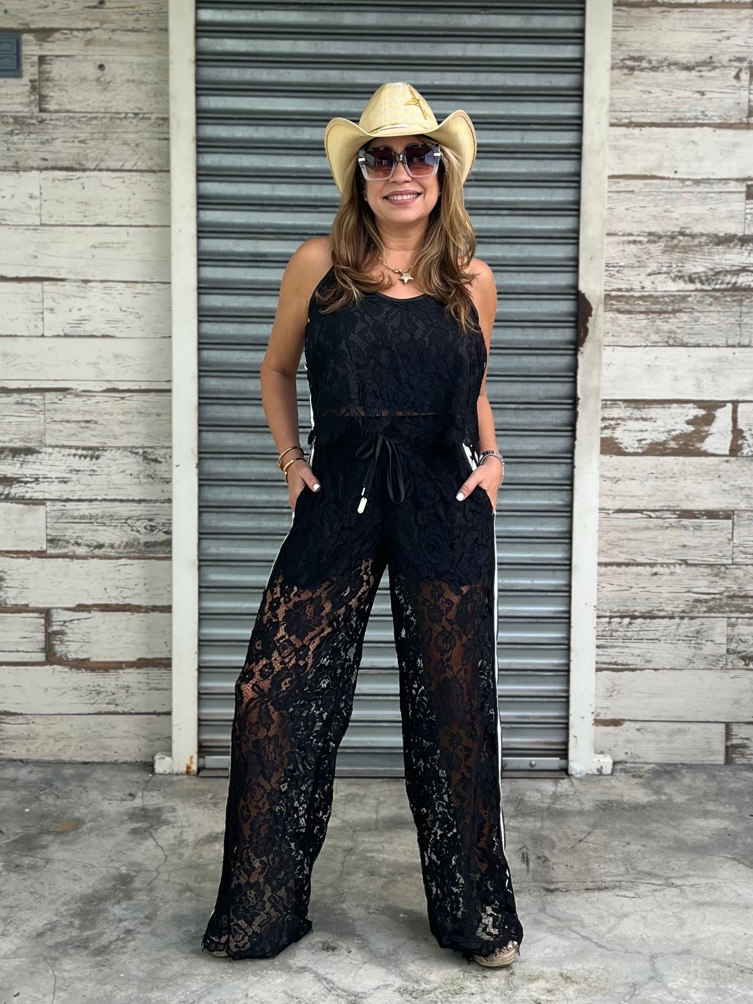 Conjunto coordinado en encaje negro. Forrado en la parte de al frente del top y forro corto en el pantalón. Detalle deportivo a los lados.