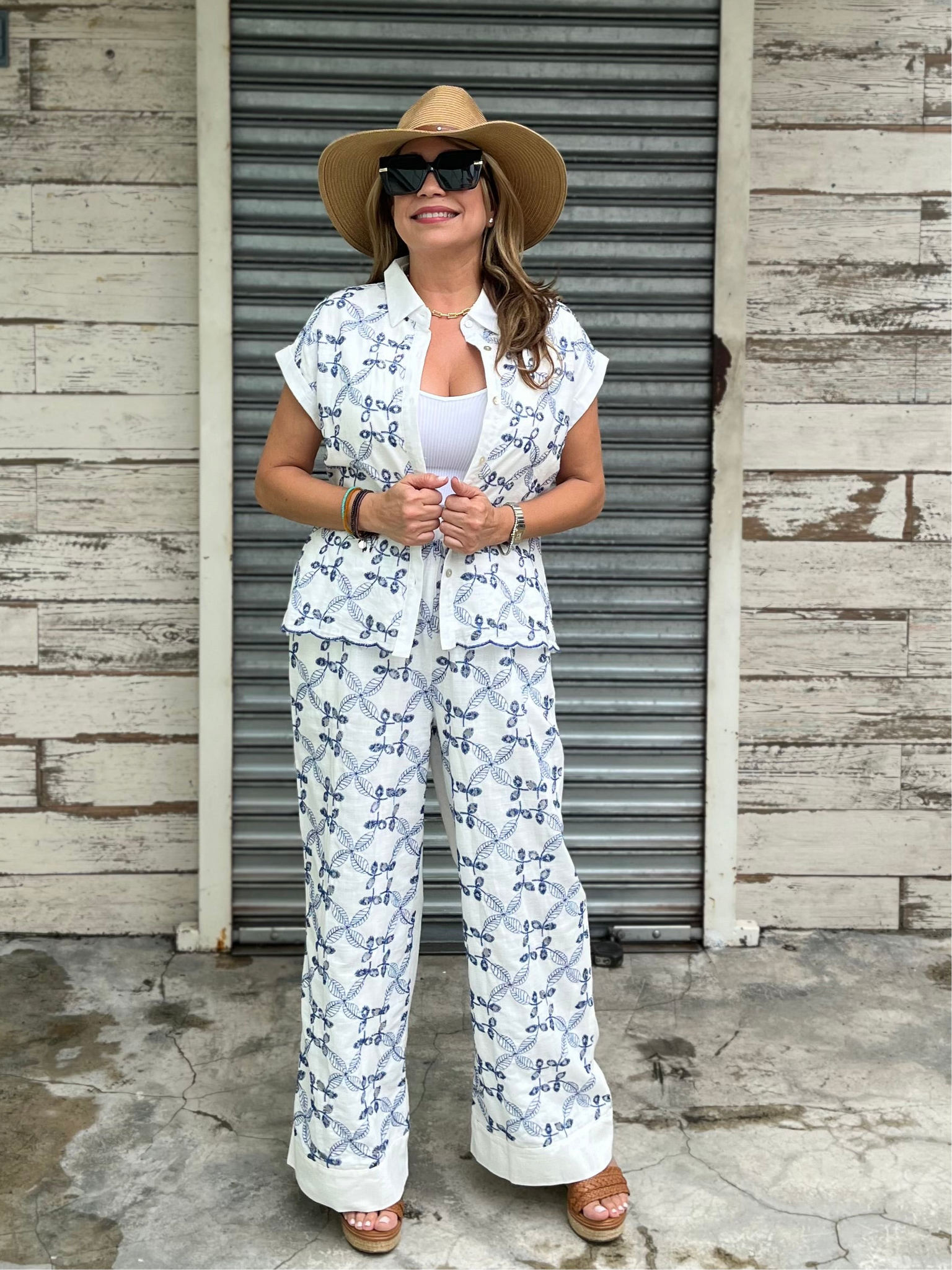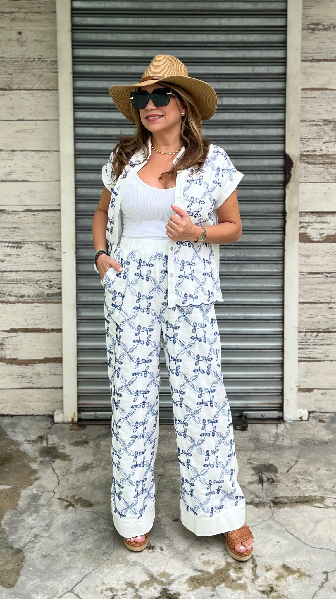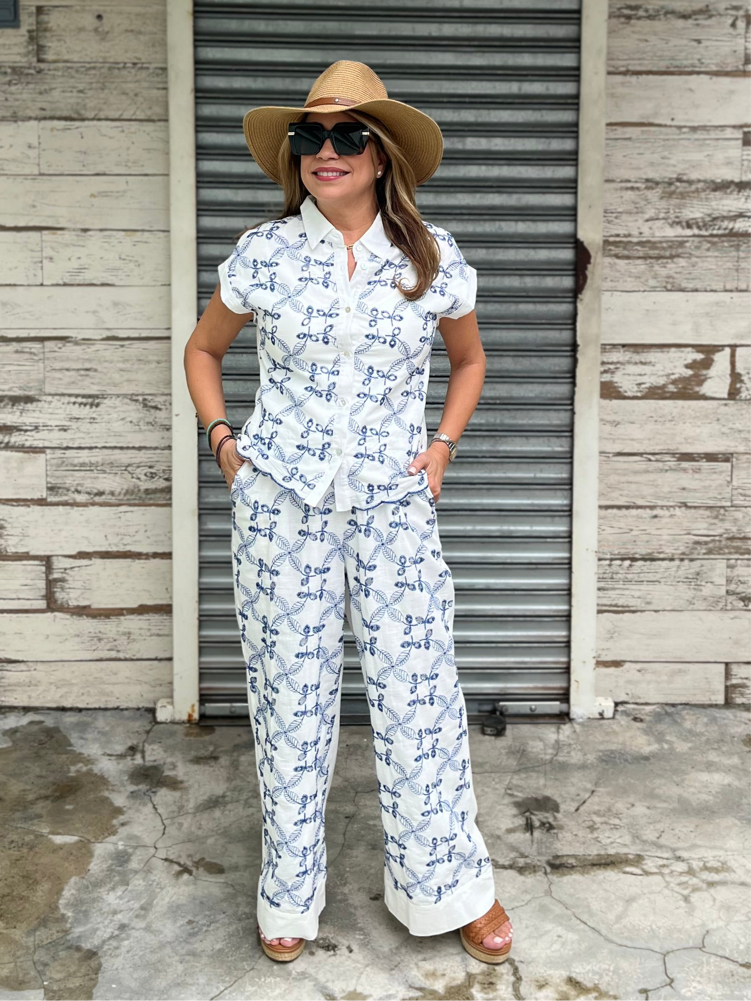 white set con detalle en cocido azul. Pantalones tienen stretch y bolsillos. Blusa button down.