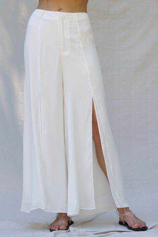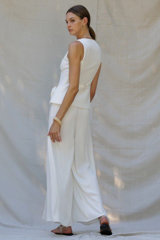 Flowy and silky, this set includes a button down vest with two flower details in the front. The pants are lined until the mid thigh where it splits to give a sexy look. Pants have zipper in the back and no pockets.