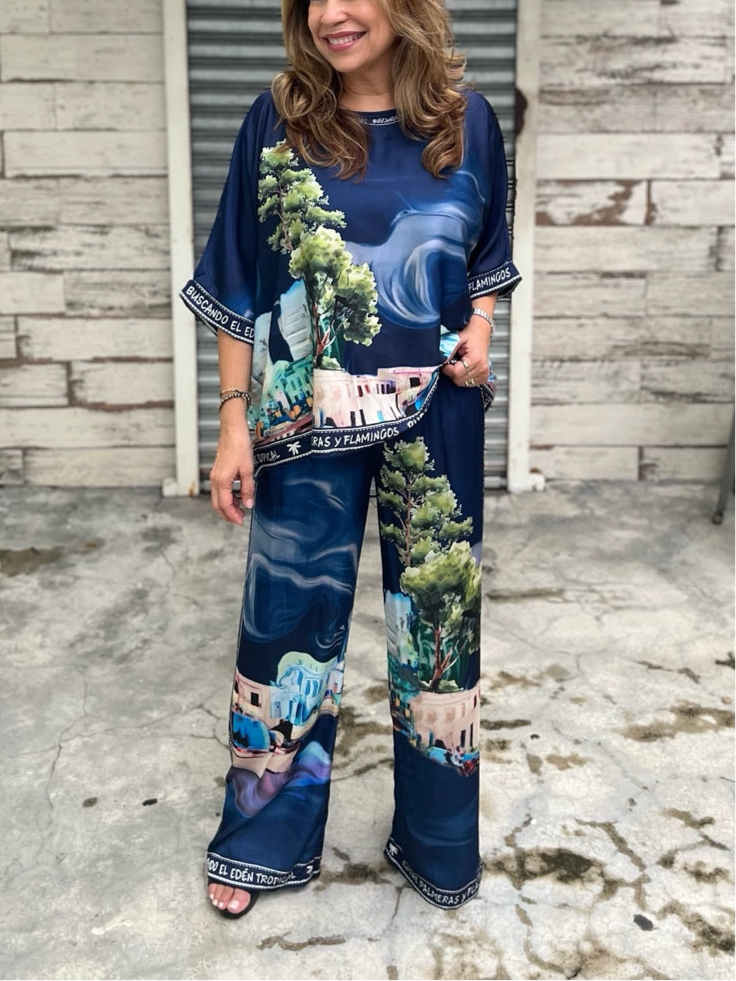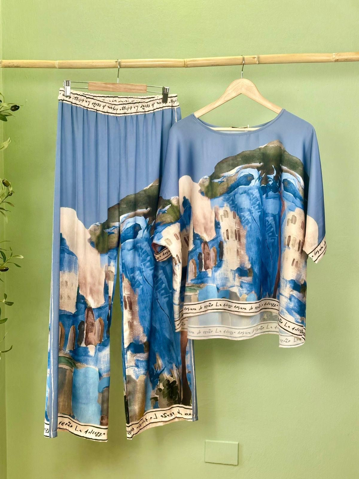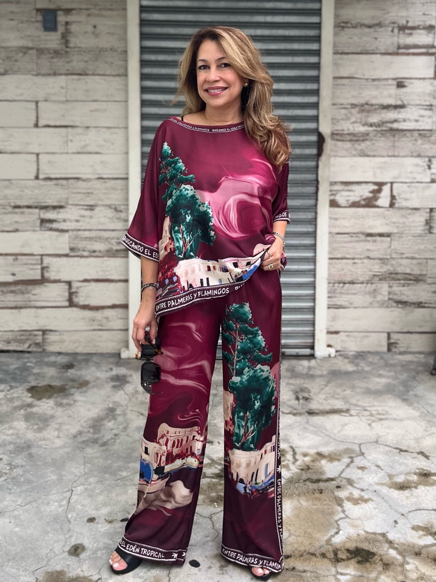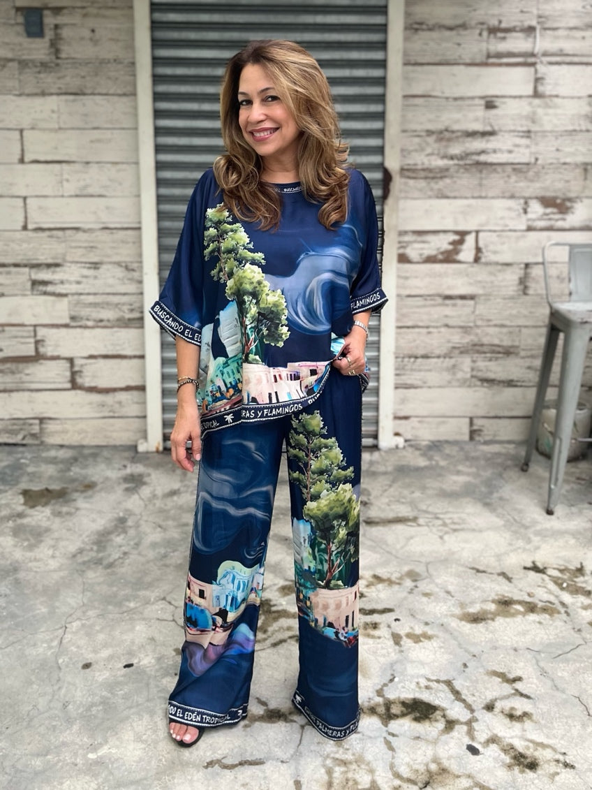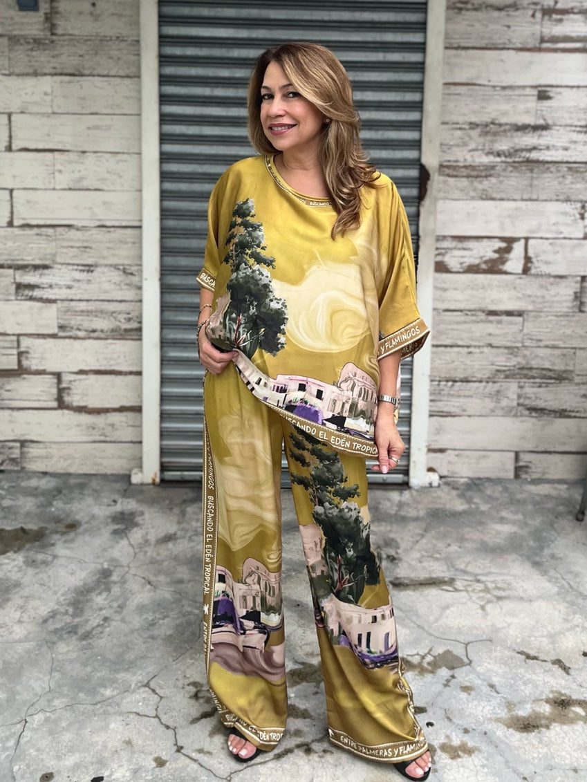 Set de dos piezas marcado como talla única, entalla small, medium y large. Pantalón estilo palazzo con elástico en la cintura. Blusa estilo túnica.